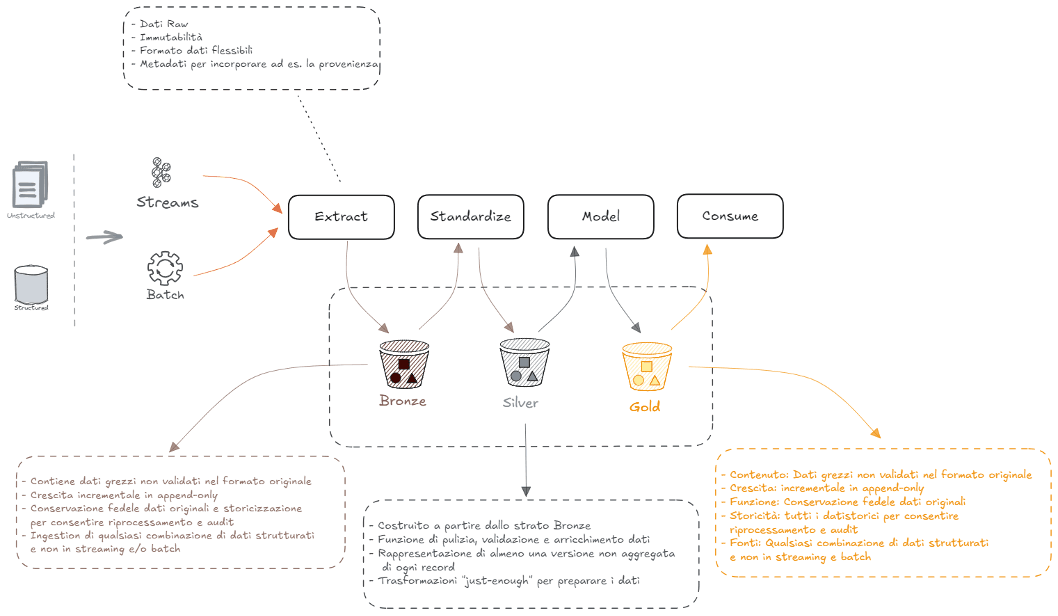 La Medallion Architecture è un pattern di data design che organizza i dati in layer logici con qualità e granularità crescenti. L'architettura prende il nome dalla progressione dei metalli preziosi – bronzo, argento e oro – che riflette il progressivo raffinamento e valore aggiunto dei dati attraverso le diverse fasi di elaborazione.