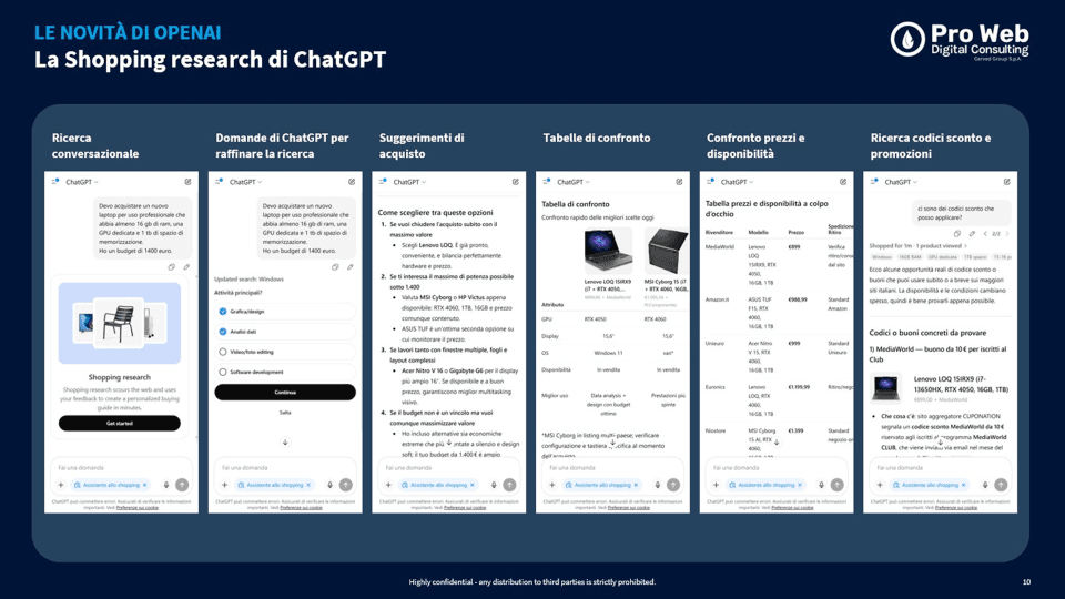 Negli Stati Uniti è disponibile da settembre anche Instant Checkout, che permette di acquistare direttamente dentro ChatGPT prodotti da Etsy e oltre 1 milione di merchant Shopify, senza uscire dalla chat. OpenAI ha anche annunciato l'Agentic Commerce Protocol (ACP), l'equivalente dell'UCP di Google, progettato specificamente per gli acquisti conversazionali all'interno di ChatGPT.