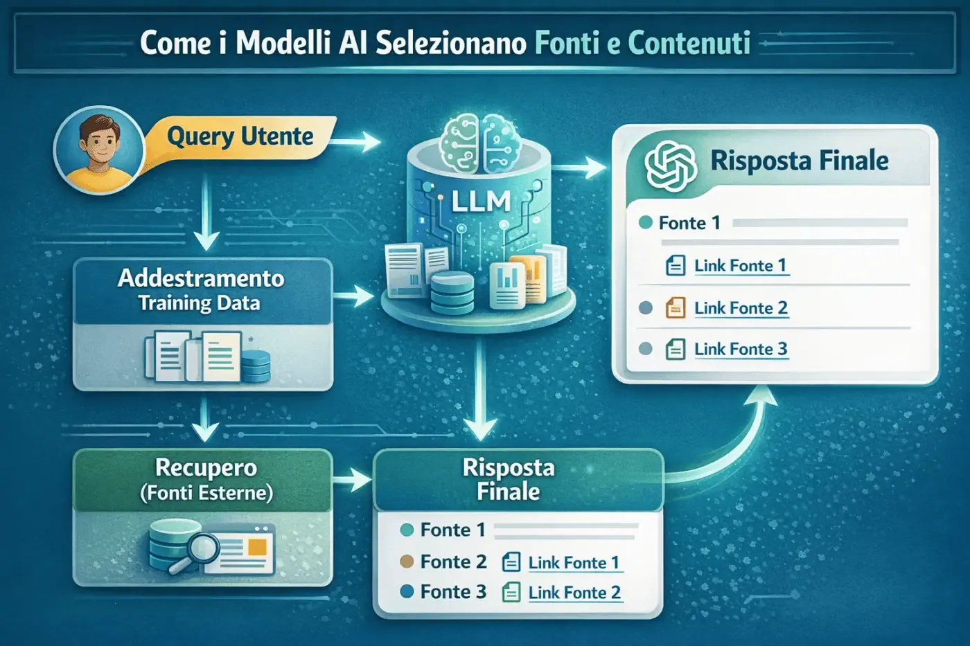 I Large Language Model si basano su due componenti principali: i dati di addestramento e i sistemi di retrieval in tempo reale. I dati di addestramento consentono all’AI di apprendere il linguaggio, i concetti e le relazioni tra le informazioni, ma non garantiscono l’accesso a dati aggiornati. Per questo motivo, molti sistemi integrano meccanismi di recupero di informazioni da fonti esterne, selezionate in base a pertinenza e affidabilità. In questo contesto, le fonti autorevoli, ben strutturate e semanticamente chiare hanno maggiori probabilità di essere utilizzate rispetto a contenuti generici o poco organizzati.
