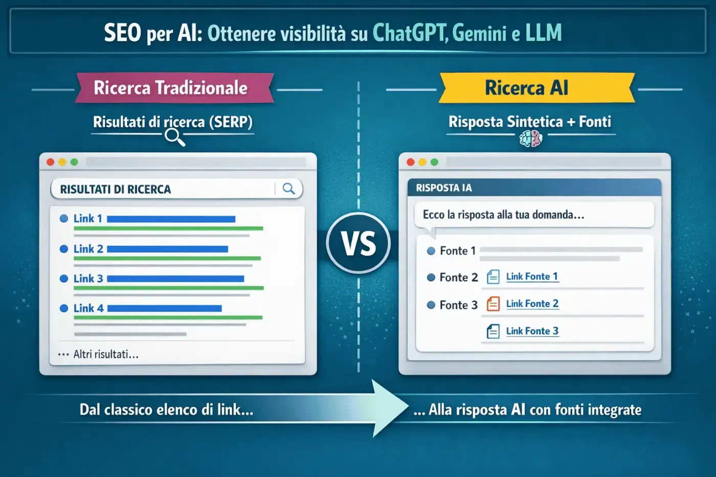 L’AI generativa consente di interpretare le query in modo più naturale, comprendere il contesto e combinare informazioni provenienti da più fonti. L’utente non cerca più solo una pagina da visitare, ma una risposta immediata a un problema o a un bisogno specifico. Questo sposta il focus dalla semplice indicizzazione dei contenuti alla loro capacità di essere compresi, sintetizzati e riutilizzati dai modelli di Intelligenza Artificiale.