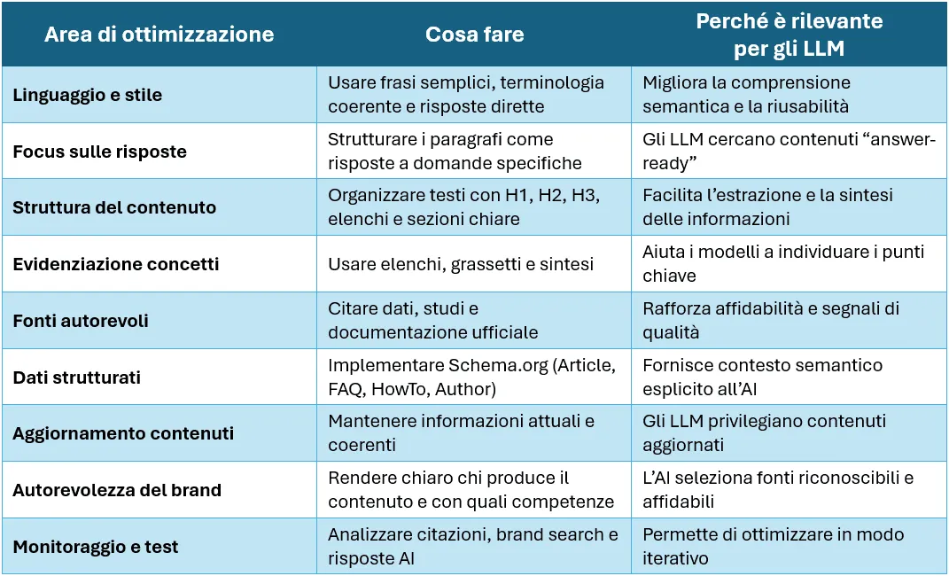 La SEO per AI sposta il focus dalla tradizionale keyword research alla intent research. Più che concentrarsi sulle singole parole chiave, diventa fondamentale comprendere le domande, i problemi e i contesti che guidano le ricerche degli utenti. Ottimizzare per intenti significa creare contenuti che rispondano in modo diretto e completo a esigenze reali, utilizzando un linguaggio naturale e orientato alla soluzione. Questo approccio aumenta la probabilità che l’AI riconosca il contenuto come rilevante e utile per costruire le proprie risposte.