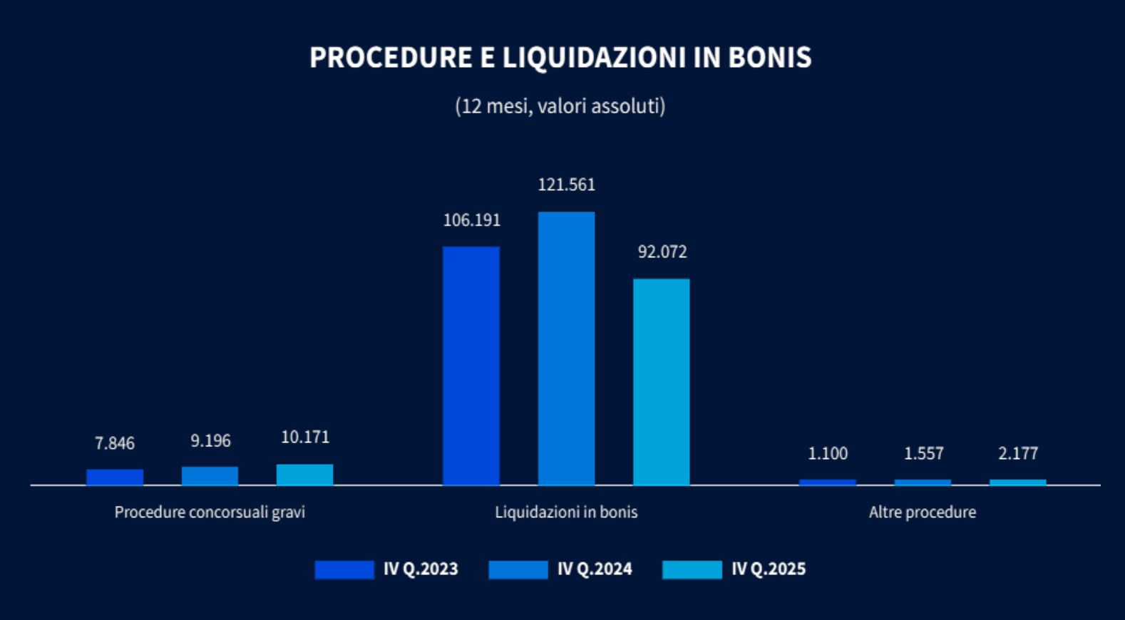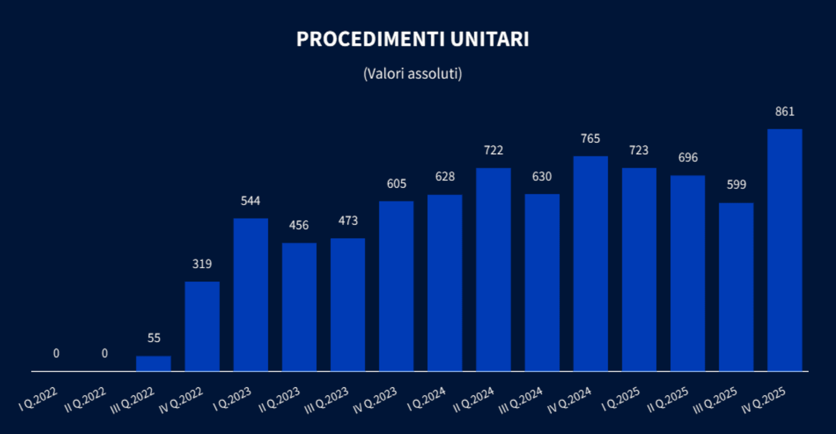 I procedimenti unitari, anch’essi introdotti dal Nuovo Codice della Crisi d’Impresa nel 2022, nel 2025 si sono mantenuti su livelli elevati con 2.879 casi, +4,9% rispetto al 2024: l’incremento del quarto trimestre (+12,5%), con il massimo storico trimestrale di casi (861), ha infatti fatto risalire il risultato totale, che nel secondo e terzo trimestre era diminuito del -3,6% e del -4,9% rispetto agli stessi periodi del 2024.