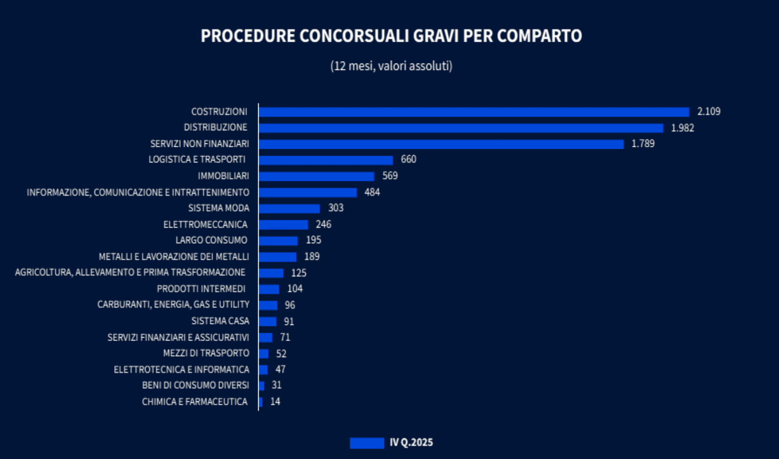La situazione più critica tra i comparti industriali riguarda le Costruzioni, con 2.109 fallimenti pari a +22,5% nel 2025 rispetto al 2024 (a cui si associano 268 procedure concorsuali, +25,2%). Seguono Elettromeccanica (+35,2%), Prodotti Intermedi (+23,8%), Carburanti, Energia, Gas e Utility (+26,3%), Informazione, Comunicazione e Intrattenimenti (+22,5%), Logistica e Trasporti (+11,9%).