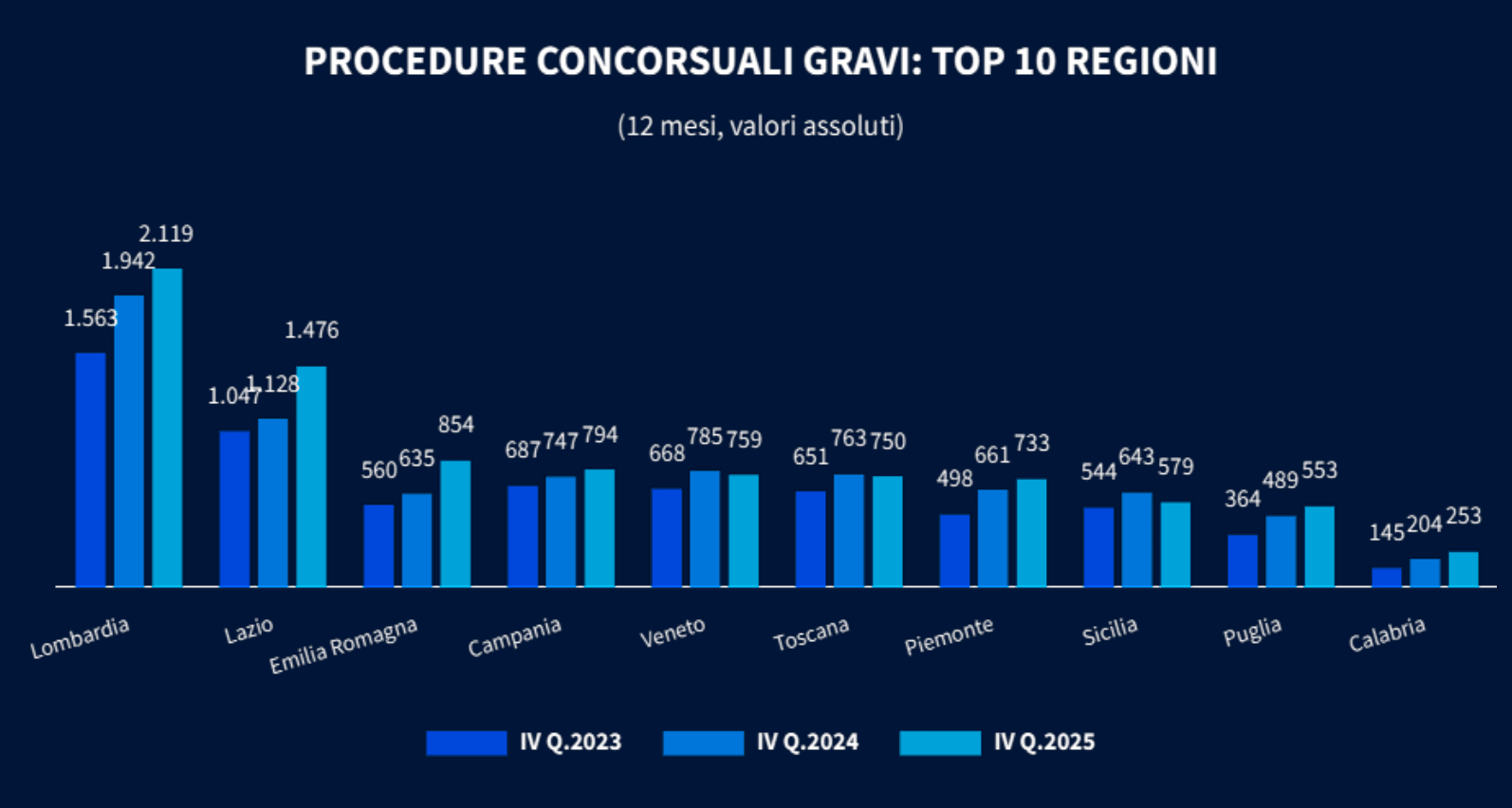 A livello geografico, l’andamento delle procedure concorsuali gravi nel 2025 è molto differenziato: il Centro Italia registra l’incremento più elevato (+16,5%), ben al di sopra della crescita media nazionale (+10,6%), dovuto in particolare al Lazio (+30,9%). L’aumento del Nord Est (+12%) è invece trainato dall’Emilia Romagna (+34,5%), regione con il maggior tasso di crescita. Nel Sud spiccano gli aumenti di Calabria (+24%) e Puglia (+13,1%). In controtendenza, invece, il Veneto (-3,3%), la Toscana (-1,7%) e la Sicilia (-10%).