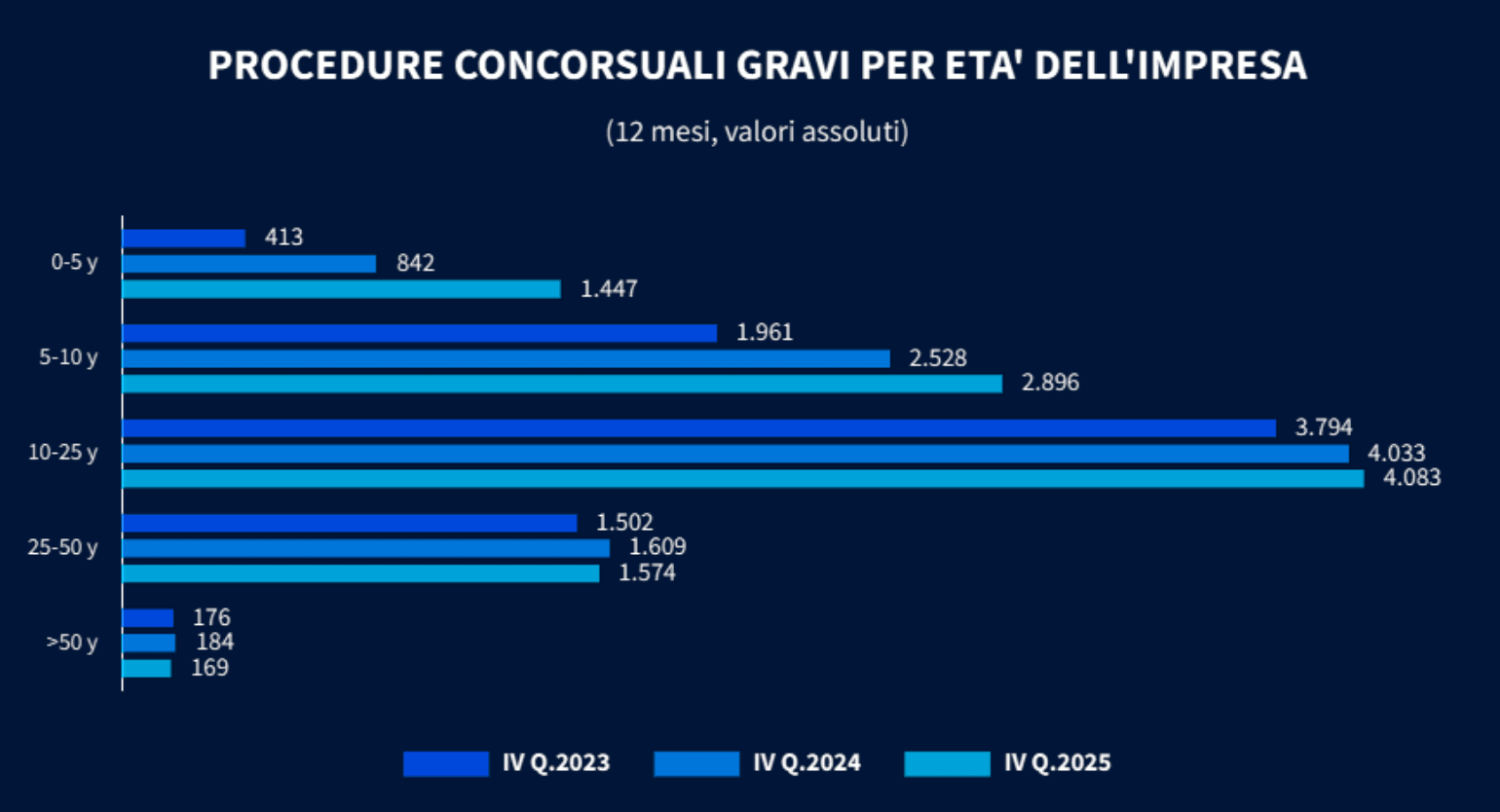 Gli shock sistemici avvenuti negli ultimi 5 anni hanno reso molto difficile l’ambiente economico per le imprese più giovani e meno strutturate: quelle con meno di 5 anni d’età, infatti, hanno visto passare le procedure concorsuali gravi dal 9,2% del 2024 al 14,2% del 2025, con un incremento del 71% nei casi aperti. Anche nelle aziende che hanno tra i 5 e i 10 anni sono cresciuti del 14,6%, mentre i dati sono in calo nelle imprese più mature (oltre 25 anni).