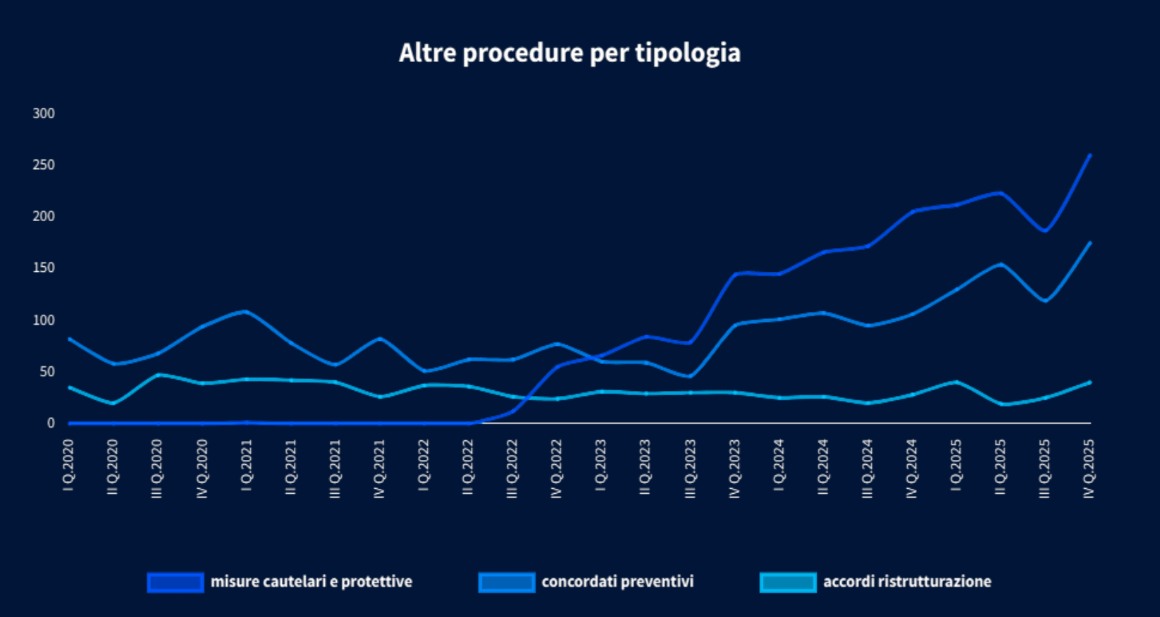 Nel 2025 crescono del +39,8% anche le altre procedure concorsuali, tra cui i nuovi strumenti di composizione delle crisi introdotti nel 2022 dal Codice della Crisi d’Impresa e d’Insolvenza. In particolare, le misure cautelari protettive registrano un +26,8% nel 2025 rispetto al 2024 (882 attivazioni), tornando a salire nel quarto trimestre dopo il calo registrato nel terzo. I concordati preventivi aumentano del +65,1%, risultando lo strumento in maggiore ascesa, gli accordi di ristrutturazione dei debiti crescono del +42,9% su base annua.
