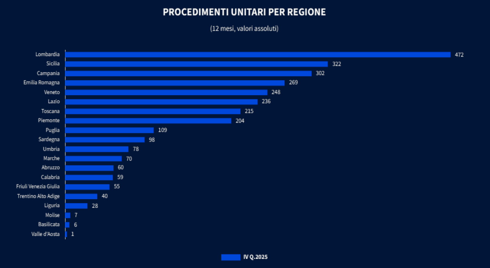 Scendendo più nel dettaglio a livello geografico, nel 2025 l’aumento dei procedimenti unitari ha riguardato i due terzi delle Regioni, con crescite importanti per Lazio (236 casi, + 49,4%), Puglia (109, +51,4%), Campania (302, +22,8%), Piemonte (204, +22,2%), Emilia-Romagna (269, +9,3%), mentre in controtendenza risultano Lombardia (472 casi, pari al 16,4% dei totale Italia e tuttavia in calo del -4,5%) e Sicilia (322 casi, l’11,2% del totale Italia, ma in diminuzione del -25,8%).